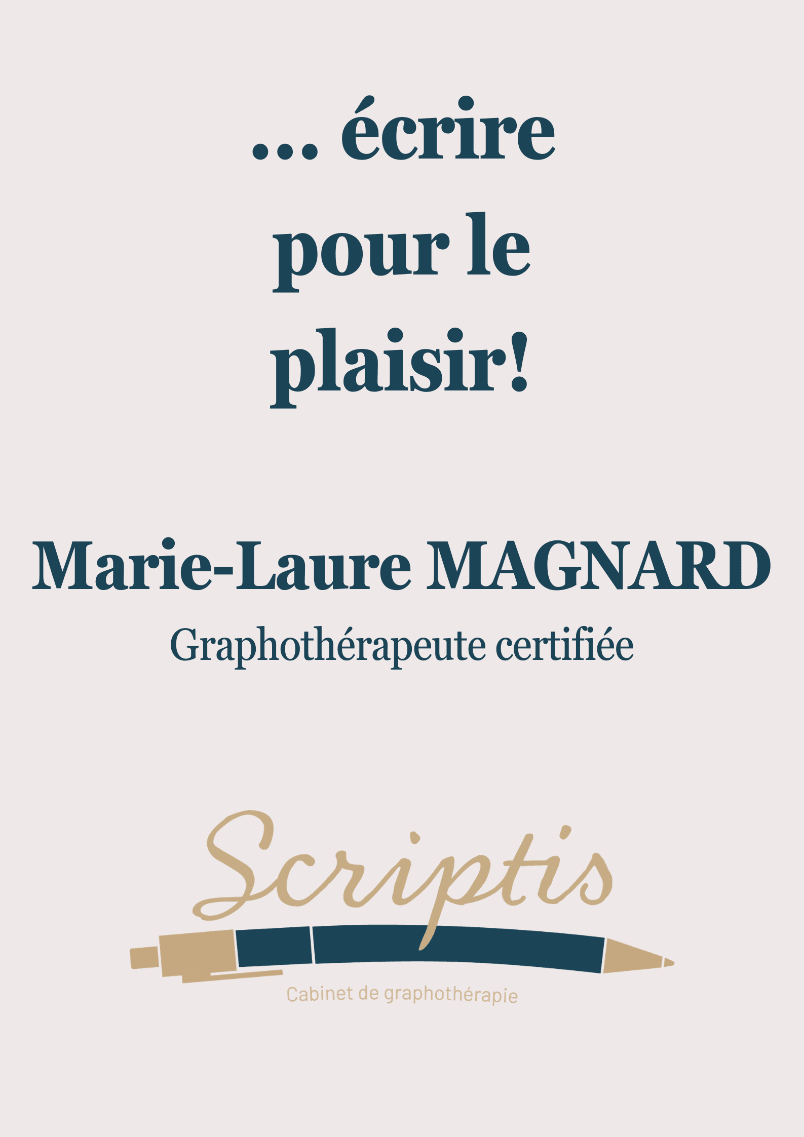 Je suis Marie-Laure MAGNARD graphothérapeute chez Scriptis cabinet de graphothérapie à Quimper et mon objectif est d’améliorer l’écriture, de redonner confiance et autonomie aux enfants/ados/adultes qui viennent en consultation, avec bienveillance au travers d’exercices personnalisés.